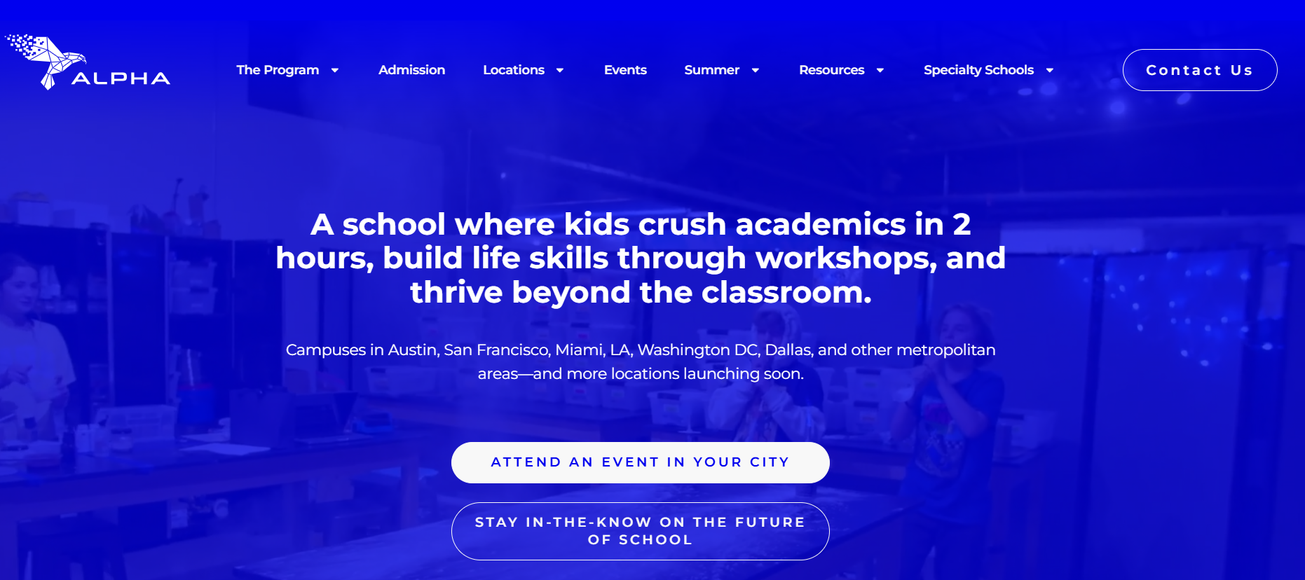 2014년 텍사스 오스틴에서 시작된 알파스쿨은 맥켄지 프라이스와 조 라몬트가 공동 설립했다.[^5] 현재 오스틴, 마이애미, 샌프란시스코, 버지니아 등에 캠퍼스를 운영하며 확장 중이다.